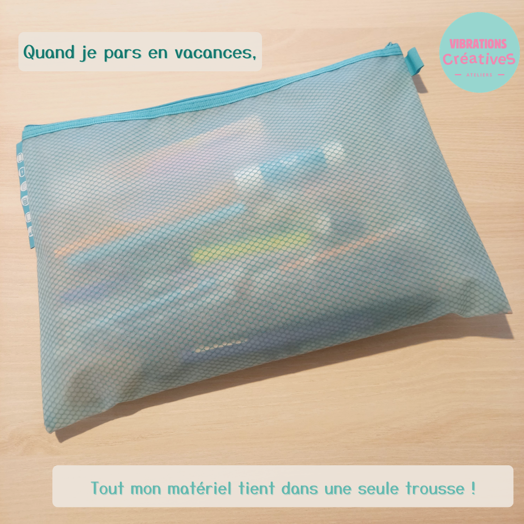 Voici un petit exemple avec ma dernière trousse de vacances : du matériel de base. Quelques stylos, un critérium, une gomme, des ciseaux, de la colle, des feutres d’enfant, des crayons de couleur, des feutres aquarellables, des pinceaux à réservoir… et voilà ! Cela suffit largement.