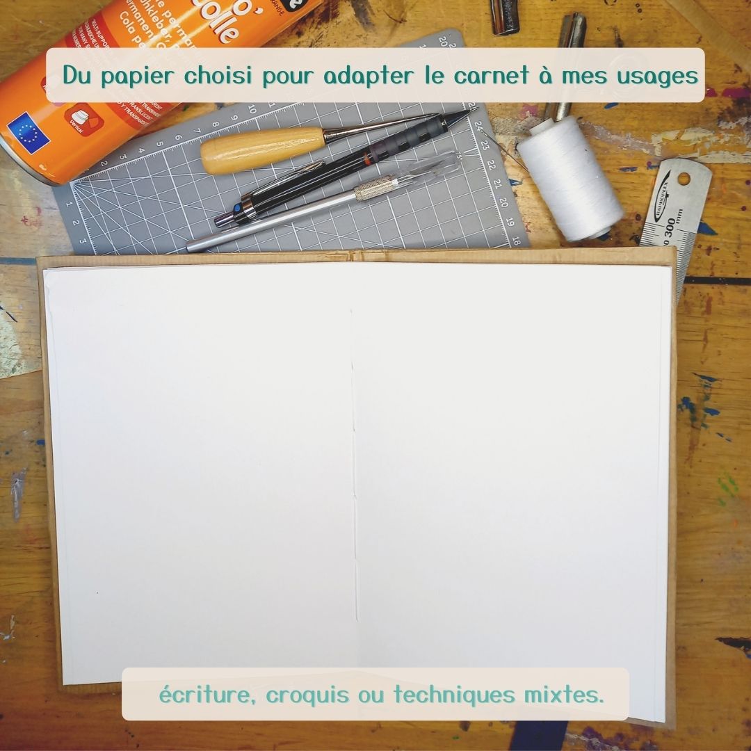 Je trouve ça toujours très sympa de créer son propre carnet, car cela permet de choisir le type de papier que l’on y met (ici, j’ai opté pour deux types de papier différents : un qui se prête à l’écriture et aux croquis, et un second plus épais pour les techniques mixtes, car j’ai emporté de l’aquarelle). On peut aussi choisir son format, la couleur de sa couverture, sa décoration, le nombre de pages : ça devient un objet encore plus personnel !
