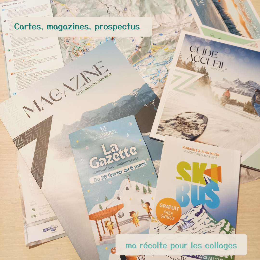 Une fois sur place, je file à l’office de tourisme pour récupérer magazines, cartes et prospectus qui me serviront pour les collages. J’utilise aussi les magazines que je lis sur place. On n’a vraiment pas besoin de grand-chose pour faire son journal créatif, ou même un carnet de voyage montagne.