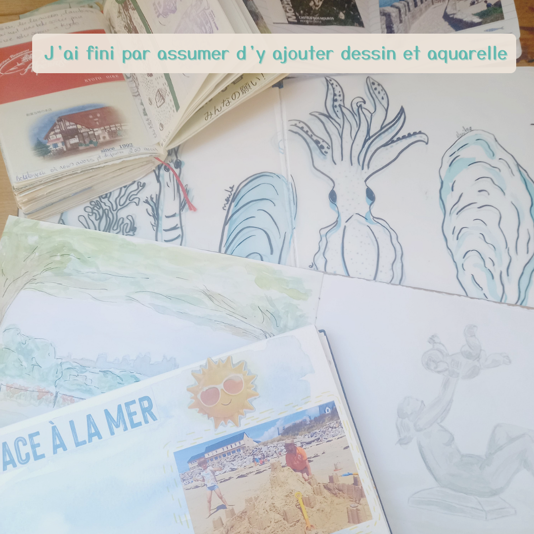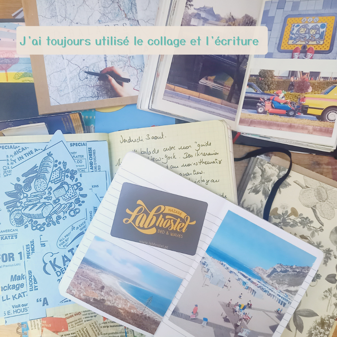 C’est drôle de voir ce qui change et ce qui perdure : certains carnets sont des journaux de bord purs, d’autres des carnets plus visuels, toujours adaptés à mes envies et aux possibilités du moment. J’utilise ce que je trouve sur place — magazines, emballages, tickets, tampons souvenirs — et j’ajoute désormais des photos imprimées sur du papier autocollant pour garder mes carnets légers.